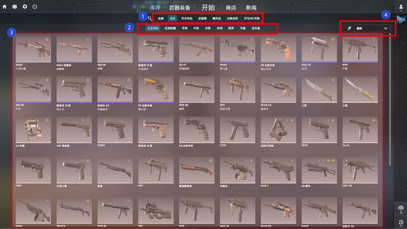 ④调整装备排列方式,鼠标点击后可选择按最新获得/最早获得的方式调整装备的展示顺序。这里涉及到武器系统对应的皮肤,道具等外围设计。