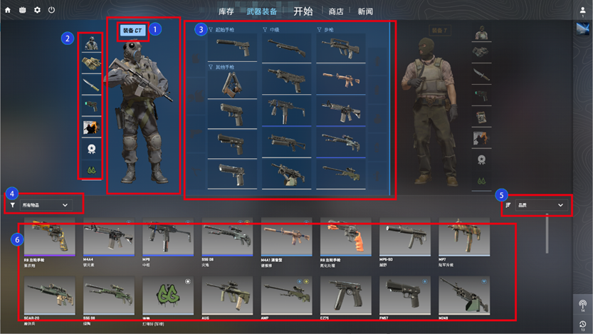 ①鼠标点击左侧这里的按钮(右侧“装备T”按钮同理),跳出装备CT武器的界面。玩家通过这里的按钮进行阵营的切换,选中按钮与未选中状态区别:未选中状态去掉高光,同时按钮背景与下层背景风格一致,但保留方框和字体颜色。选中有高光,但是字体为黑色,且有对应颜色填充。