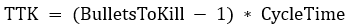 AK-47 vs 有盔敌人身体:需要4发,CycleTime=0.1s,TTK = (4-1)*0.1 = 0.3s。