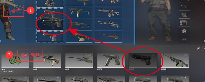 由②③两个个部分组成的装备为玩家进入到对局内能够使用的装备,在此之外的武器则无法在局内使用。